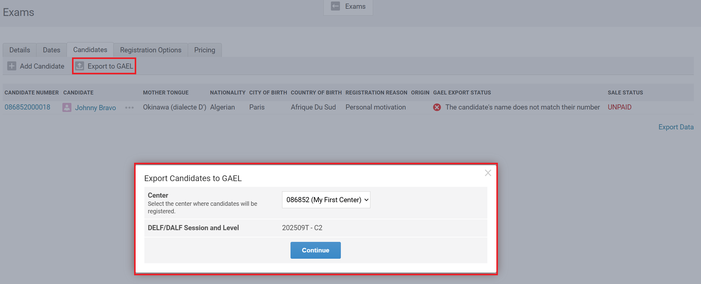 When a student registers for a DELF/DALF exam through Oncord, their registration details can be pushed to GAEL ensuring that every