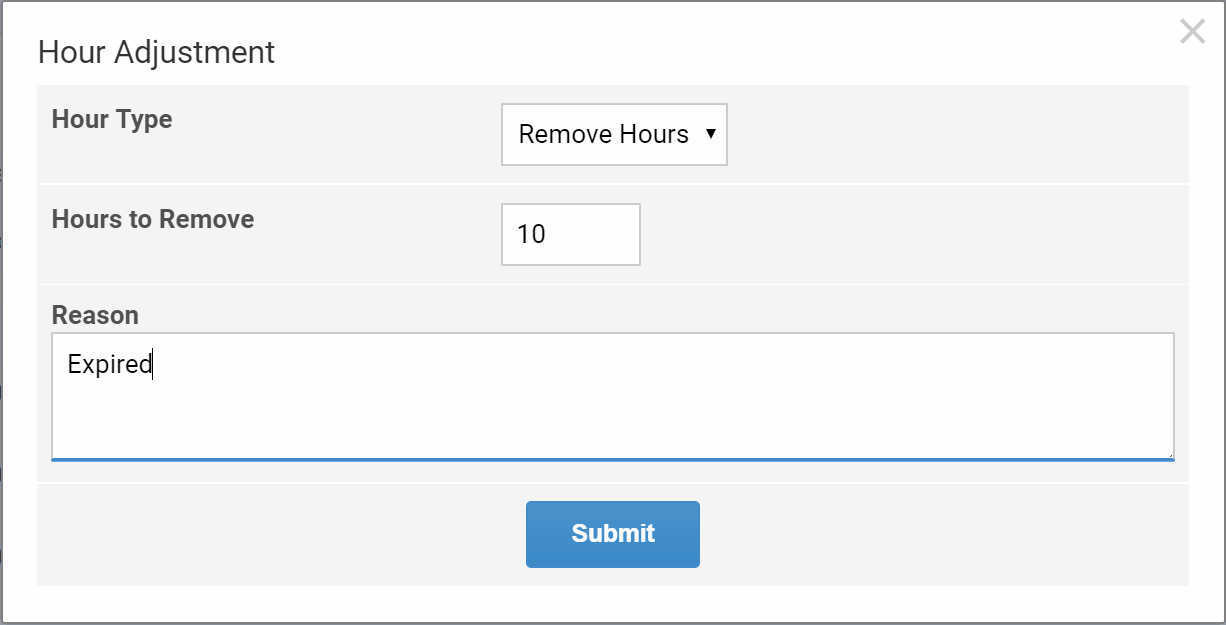 add a manual adjustment which will affect the balance of hours. For instance, you could expire hours, or credit extra hours.