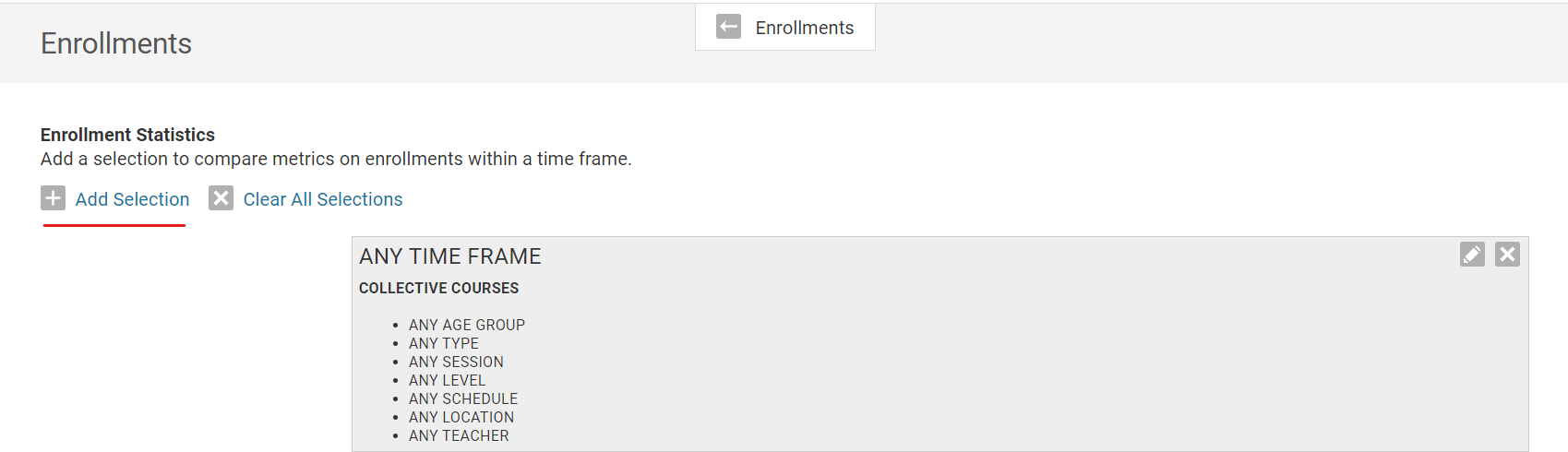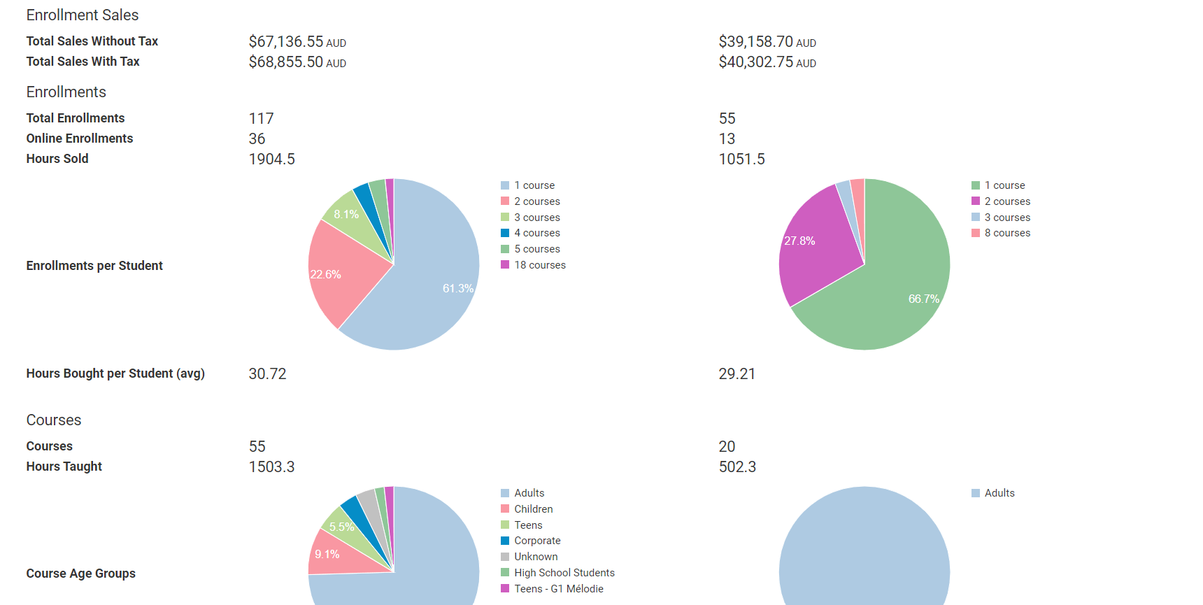 To get Enrollment Statistics (including hours bought, sold, number of students in a session, etc..), follow the following steps: