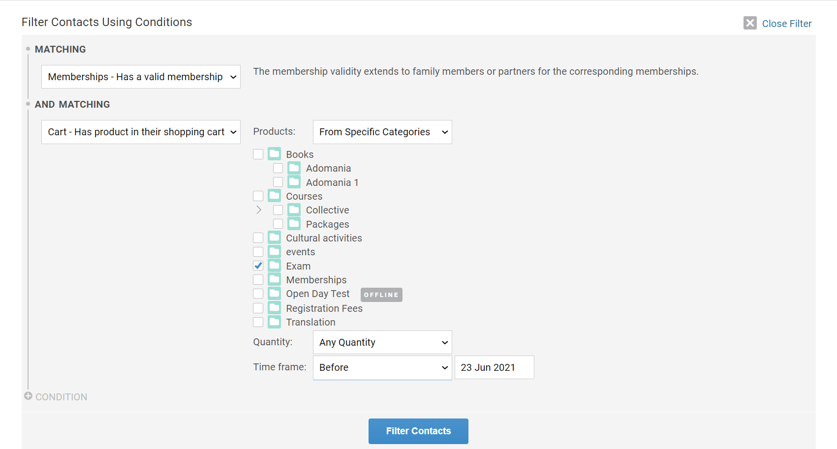 In this example below, we want to see all contacts who have an active membership AND who have bought any product in the exam product category